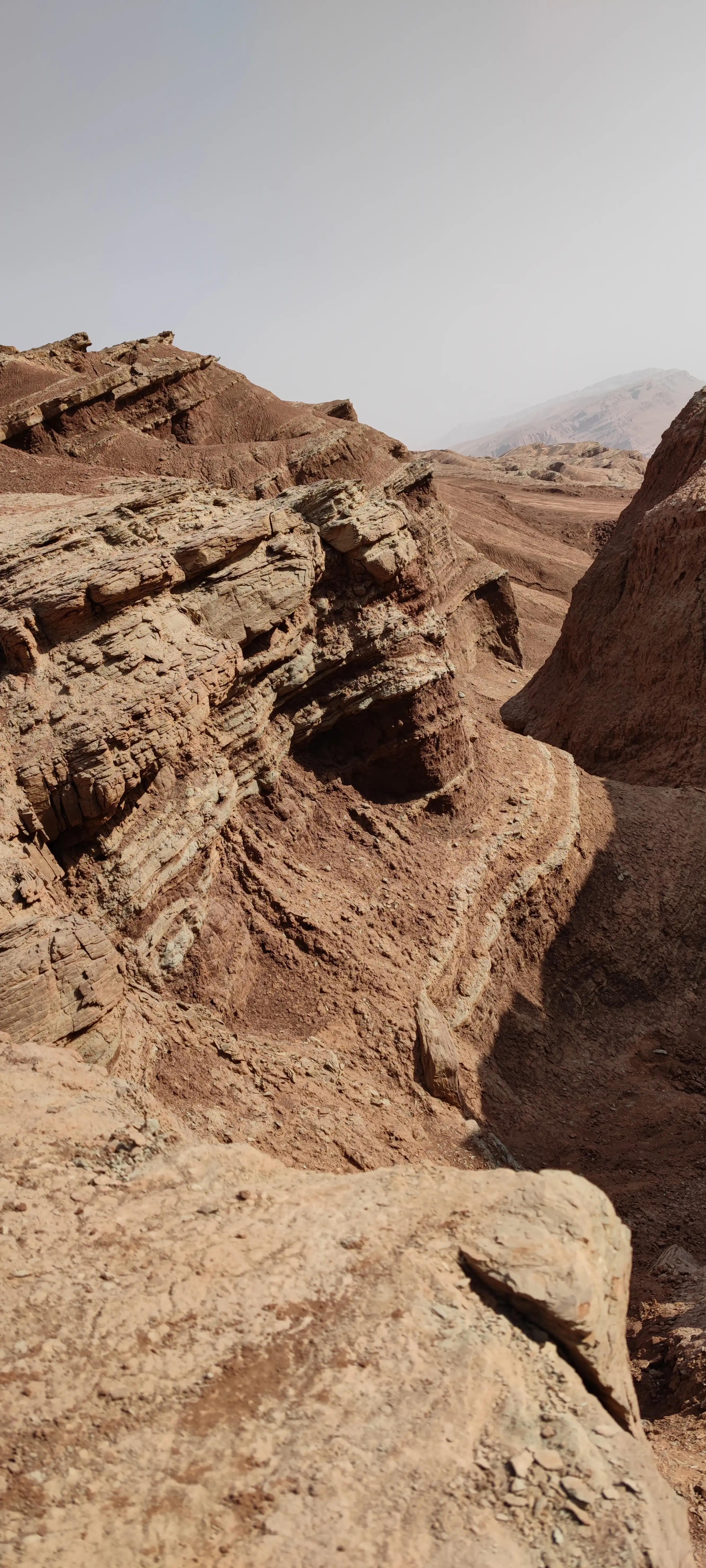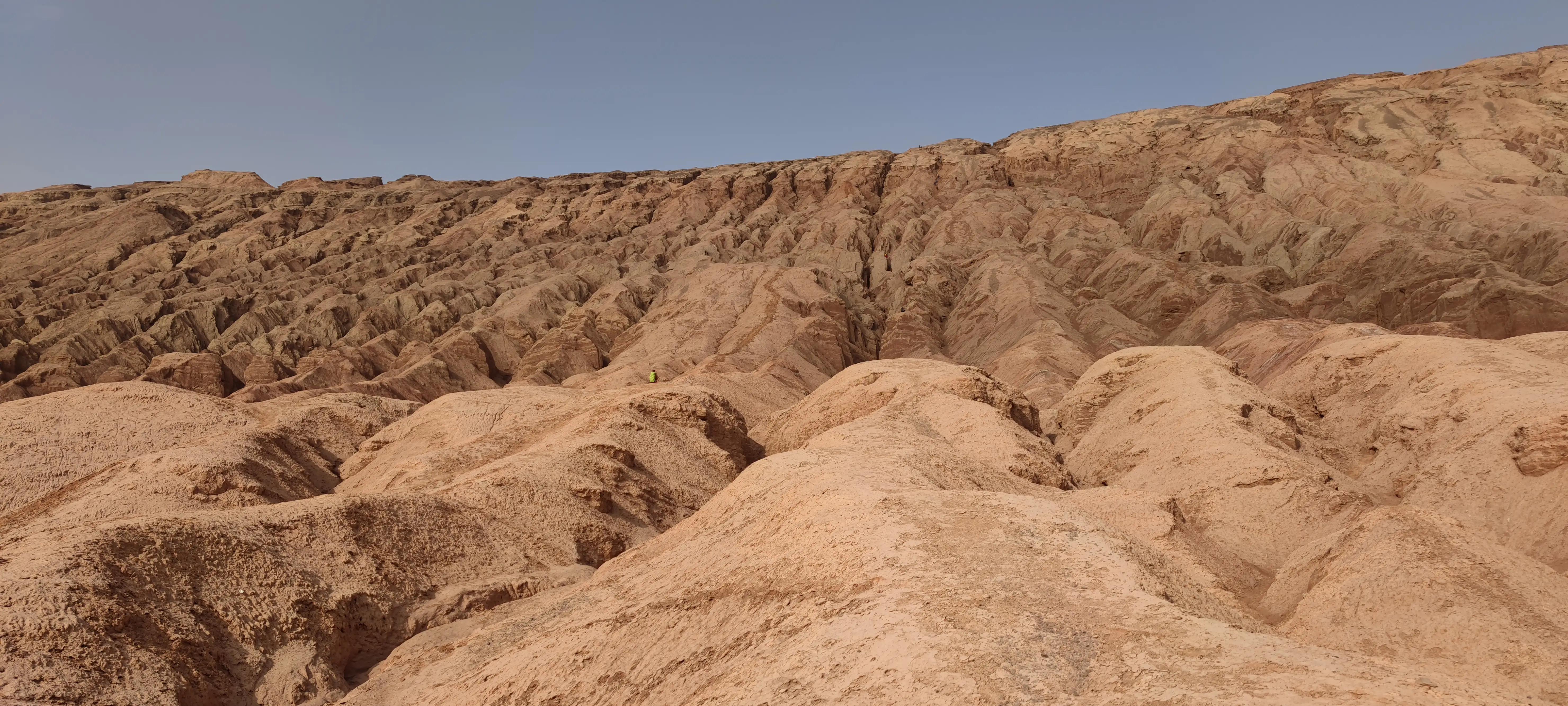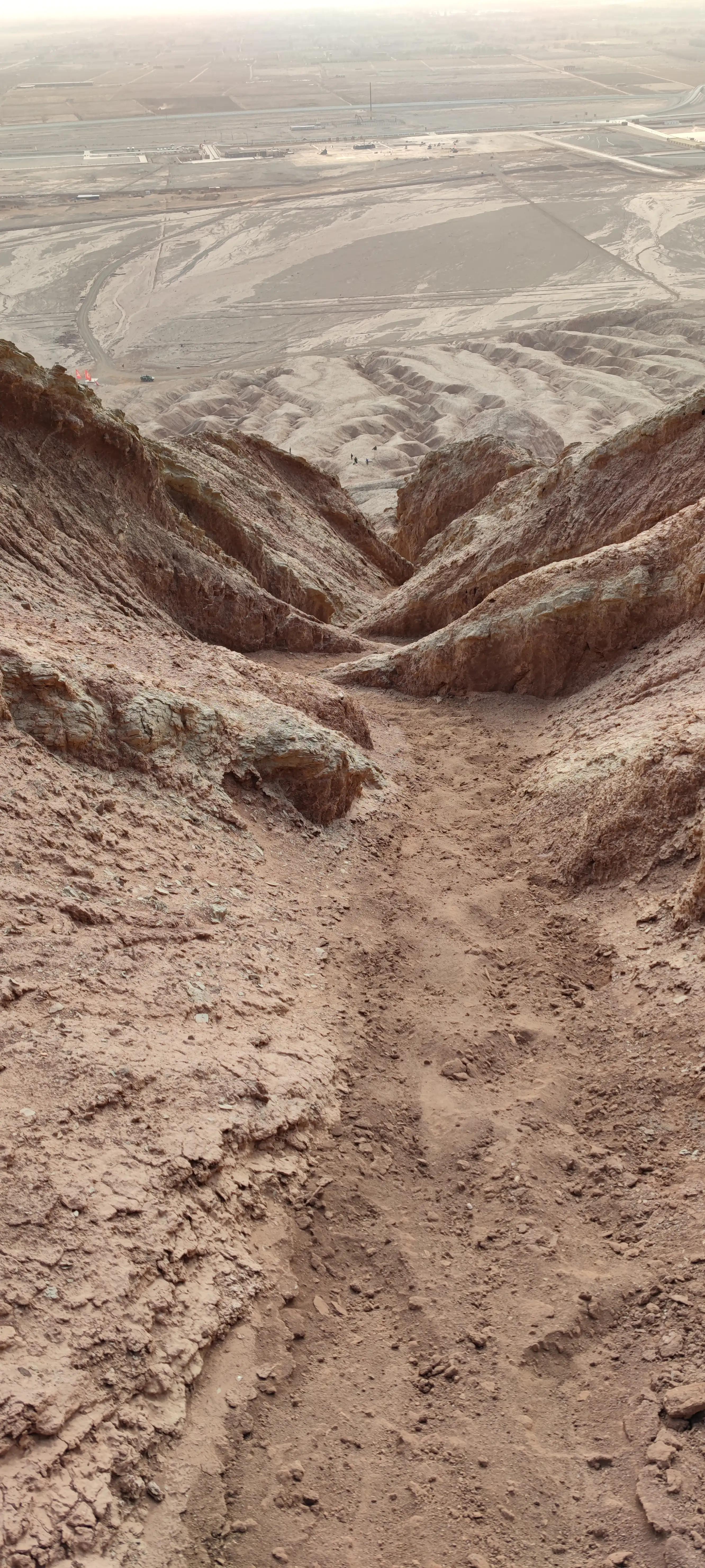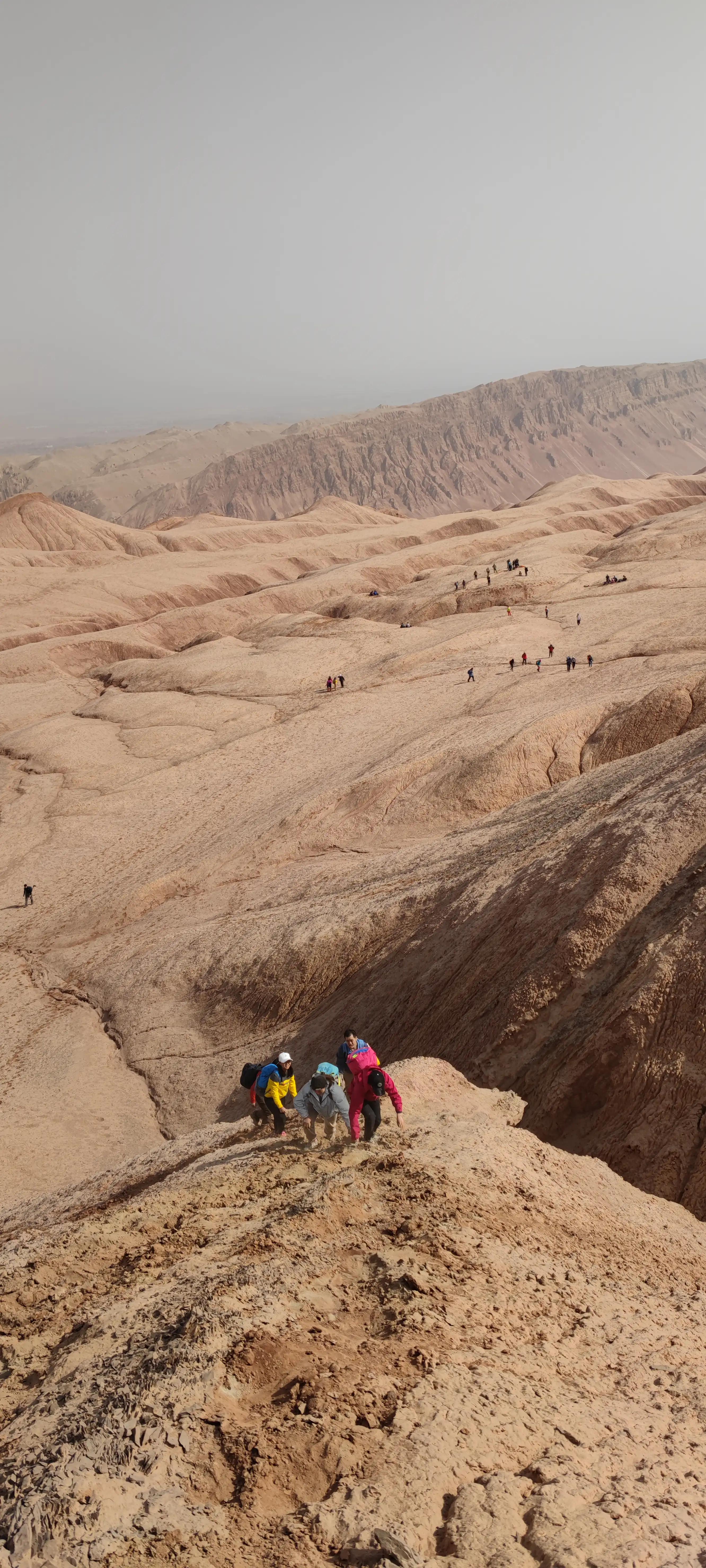 火焰山南北七八公里,徒步穿越需要翻越好几个山头,或峡谷,或山脊,或沙地,或石砾…一路灰尘土脸,下到山底从景区回望走过的路,真厉害!!!